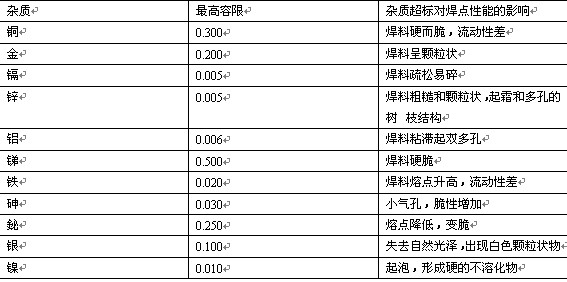 表1焊料(liào)雜質容限(xian)及對焊接(jie)質量的影(ying)響
